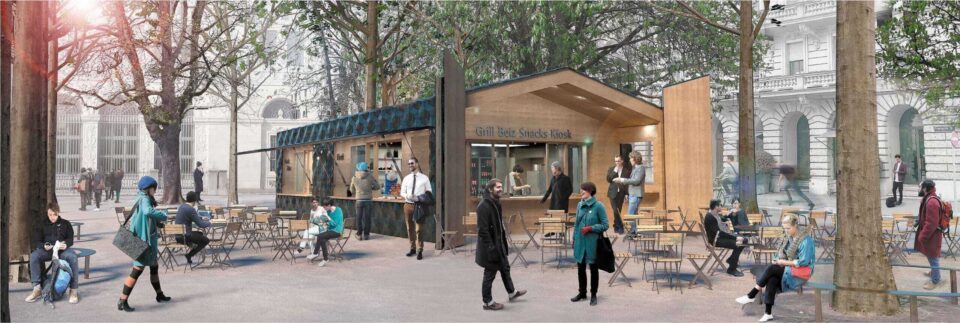 Der neue Kiosk bildet zusammen mit dem historischen Maillard-Pavillon und dem WC-Gebäude eine Folge von drei Bauwerken, die die Stadthausanlage prägen. Der achteckige Maillard-Pavillon bleibt das Zentrum, während der Kiosk so gesetzt ist, dass Sichtbezüge zum Pavillon, zum Geiser-Brunnen und zur Kurt-Guggenheim-Anlage erhalten bleiben. Das Gebäude orientiert sich entlang der Fraumünsterstraße, steht jedoch innerhalb des bestehenden Baumrasters. Mit rechteckigem Grundriss und klassischem Satteldach fügt es sich ruhig in die städtebauliche Ordnung ein. Im geschlossenen Zustand wirkt der Kiosk kompakt, geöffnet formulieren Tore und Schiebefenster klare Gesten zum Außenraum. Ein nach Süden gerichteter, überdachter Vorraum verbindet den Betrieb mit dem Markt und bietet Schutz vor Witterung. Die Organisation ermöglicht eine flexible Nutzung mit Verkaufsfenster zum Markt und einem wettergeschützten Ausgabebereich für Speisen. Auch im Winter ist ein reduzierter Betrieb möglich. Die Fassade aus recycelten Schmelzglasplatten mit grünblauem Schimmer knüpft an die plastischen Fassaden der Altbauten an und integriert Photovoltaik. Tragende Wände aus gedämmter Holzständerkonstruktion und sichtbares Tannen und Fichtenholz im Innenraum erzeugen eine warme Atmosphäre. Die verschraubte und gesteckte Bauweise erleichtert Reparatur, Umbau und Wiederverwendung. Auf Beton wird verzichtet; der Bau ruht auf einem verdichteten Schotterfundament mit Schraubankern, was Ressourcen schont und den CO₂-Ausstoß reduziert. Dach und Fassade unterstützen winterliche Wärmegewinne und sommerlichen Hitzeschutz, ergänzt durch das Blätterdach der Bäume in der Anlage. Der Stadt Haus Kiosk steht damit in der Tradition prägender Kleinbauten im urbanen Raum, verbindet historische Bezüge mit zeitgemäßer Konstruktion und stärkt die Stadtkultur durch nachhaltige, flexible Architektur.