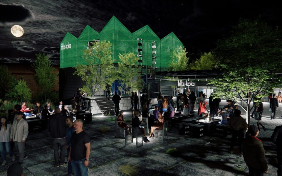 Das Horst Music and Arts Festival verwandelt eine industrielle Landschaft für drei Tage in einen offenen Kulturraum. In diesem Umfeld entsteht The Crown, eine temporäre Gerüststruktur, die nachts als leuchtendes Zeichen über dem Gelände steht. Der Einstieg erfolgt über die Plaza mit der markanten Fritz Kola Bar. Sie bildet den sozialen Mittelpunkt, strukturiert den Raum und führt weiter zur höchsten Bühne des Festivals. The Crown erhebt sich mit einer klaren Zickzackfigur über den Dächern. Nachts wird sie zum Lichtsignal. Oben öffnet sich der Blick über das Gelände und die Kühltürme des Kraftwerks. Die Struktur ist barrierefrei zugänglich: breite Treppe, Industrieaufzug, eine zusätzliche niedrigere Terrasse als ruhige Zone. Metallprofile sorgen für sichere, robuste Laufflächen. Das Projekt basiert auf einem modularen Gerüstsystem, erfüllt alle Sicherheitsvorgaben und wird gemeinsam mit einem lokalen Betrieb realisiert. Zwei Tage Aufbau, ein Tag Abbau, alle Elemente werden wiederverwendet. So verbindet The Crown eine prägnante Geste mit effizienter, ressourcenschonender Umsetzung.